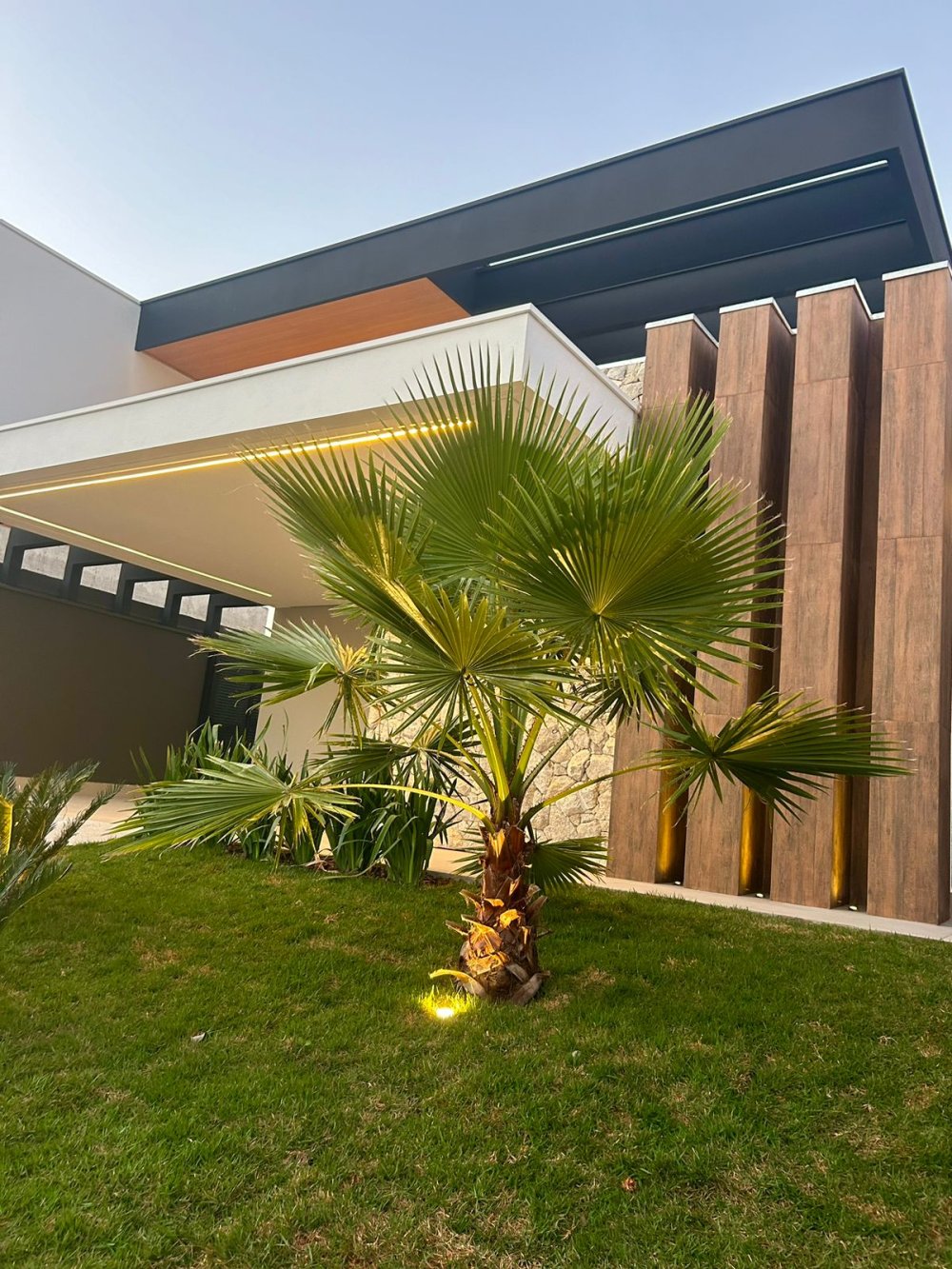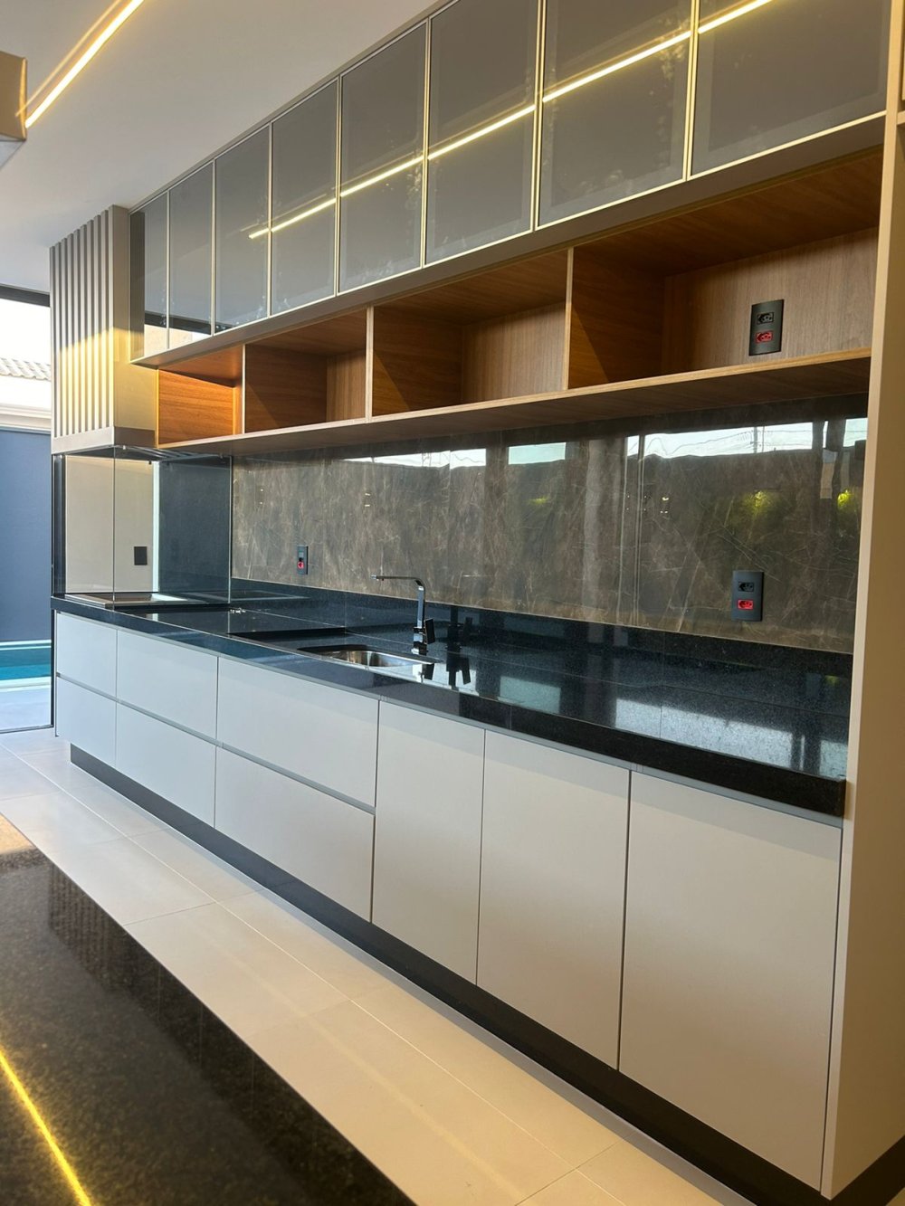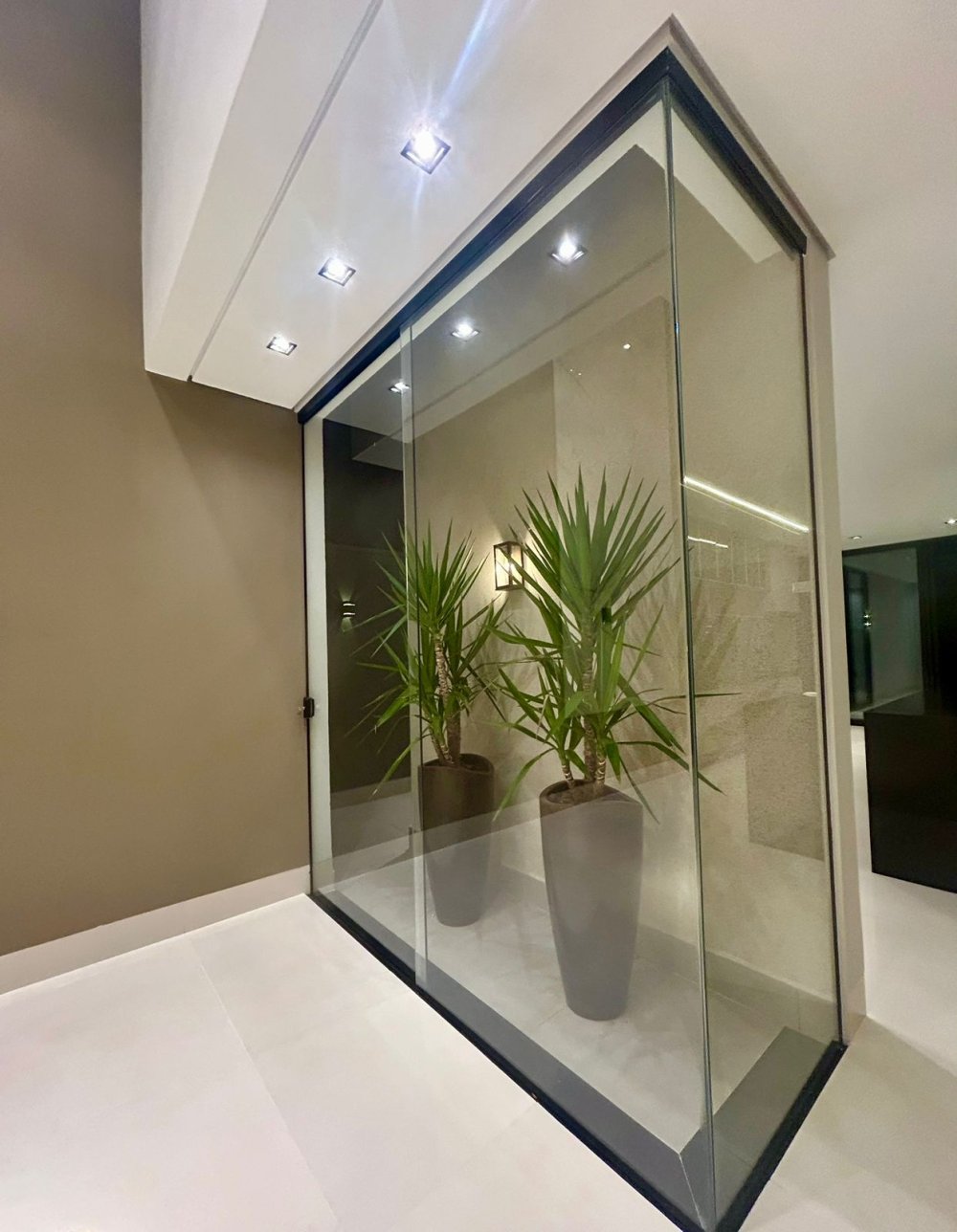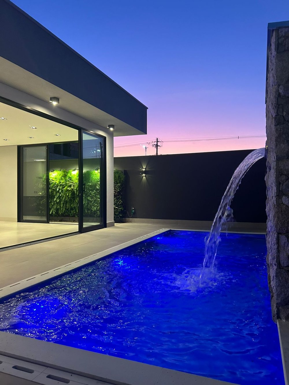 03 suítes com móveis planejados (sendo a master com closet) e portas balcão. Sala com pé direito duplo, jardim de inverno e painel de TV em porcelanato, escritório com bancada e prateleiras. Área gourmet repleta de armários com vidros reflecta bronze, fogão cooktop 5 bocas, coifa de ilha em inox e churrasqueira. Banheiro social com box e chuveiro e lavanderia coberta com acesso ao corredor externo. Destaque no paisagismo para o jardim vertical anexo à área gourmet com sistema de irrigação automatizado. Já a área de lazer contempla uma linda piscina (6,75m x 2,85m) com revestimento em porcelanato, ampla prainha, cascata revestida em pedra moledo, hidromassagem e iluminação LED. Conta ainda com um chuveirão de banho lateral.