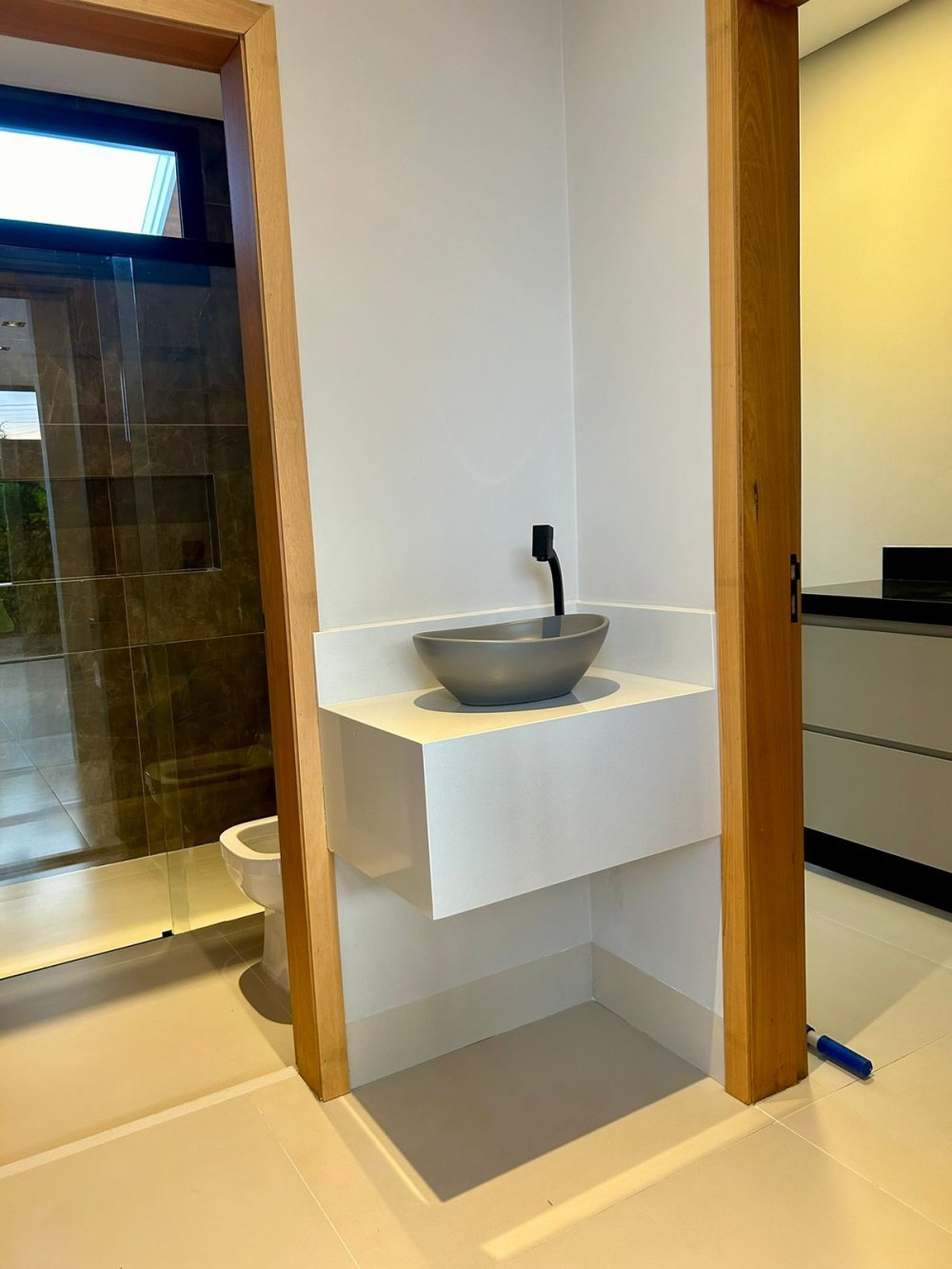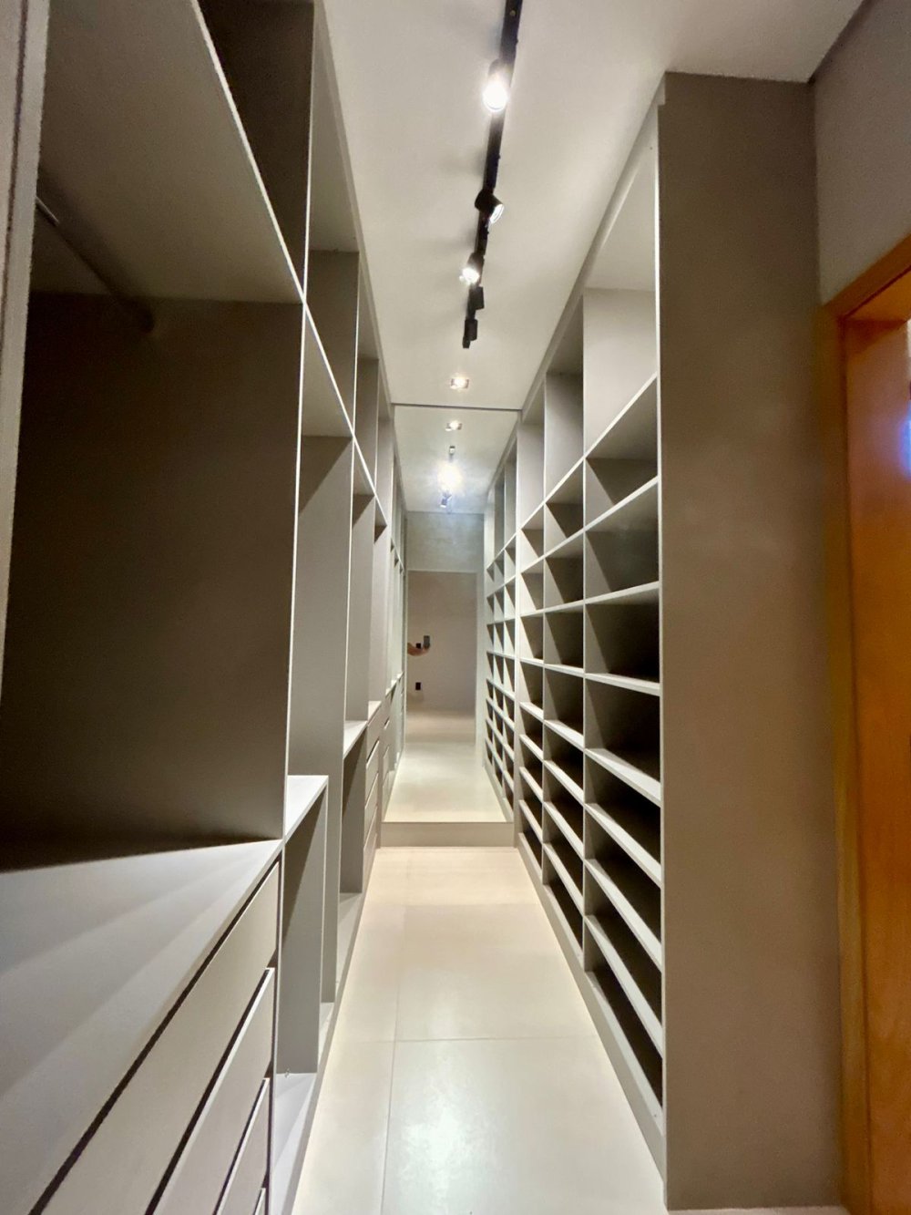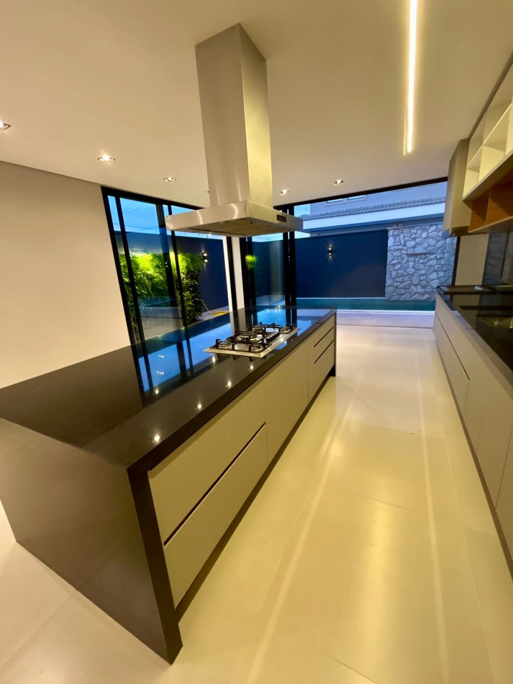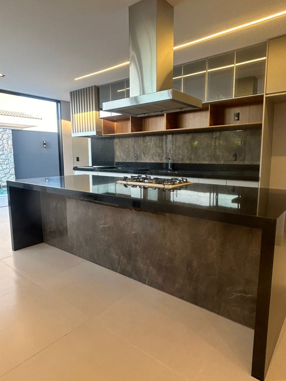 03 suítes com móveis planejados (sendo a master com closet) e portas balcão. Sala com pé direito duplo, jardim de inverno e painel de TV em porcelanato, escritório com bancada e prateleiras. Área gourmet repleta de armários com vidros reflecta bronze, fogão cooktop 5 bocas, coifa de ilha em inox e churrasqueira. Banheiro social com box e chuveiro e lavanderia coberta com acesso ao corredor externo. Destaque no paisagismo para o jardim vertical anexo à área gourmet com sistema de irrigação automatizado. Já a área de lazer contempla uma linda piscina (6,75m x 2,85m) com revestimento em porcelanato, ampla prainha, cascata revestida em pedra moledo, hidromassagem e iluminação LED. Conta ainda com um chuveirão de banho lateral.